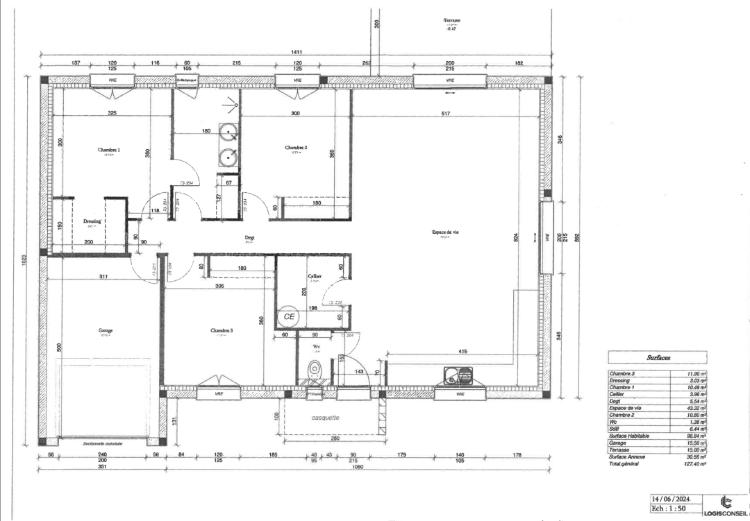 Pavillon neuf de 97m2 habitables sous décennale constructeur, d'une surface de plancher de 127m2, à la norme environnementale RE 2020, comprend une entrée avec casquette d'accueil, une pièce à vivre avec cuisine ouverte sur salon séjour de 43,32 M2 avec deux baies vitrées dont une donnant sur terrasse, un WC, un cellier, un dégagement, une salle d'eau avec WC de 6,44 M2 , une chambre de 10,49 M2 avec dressing de 3,03 M2 , deux chambres avec placards d'une surface de 11,90 et 10,80 M2 et un garage.