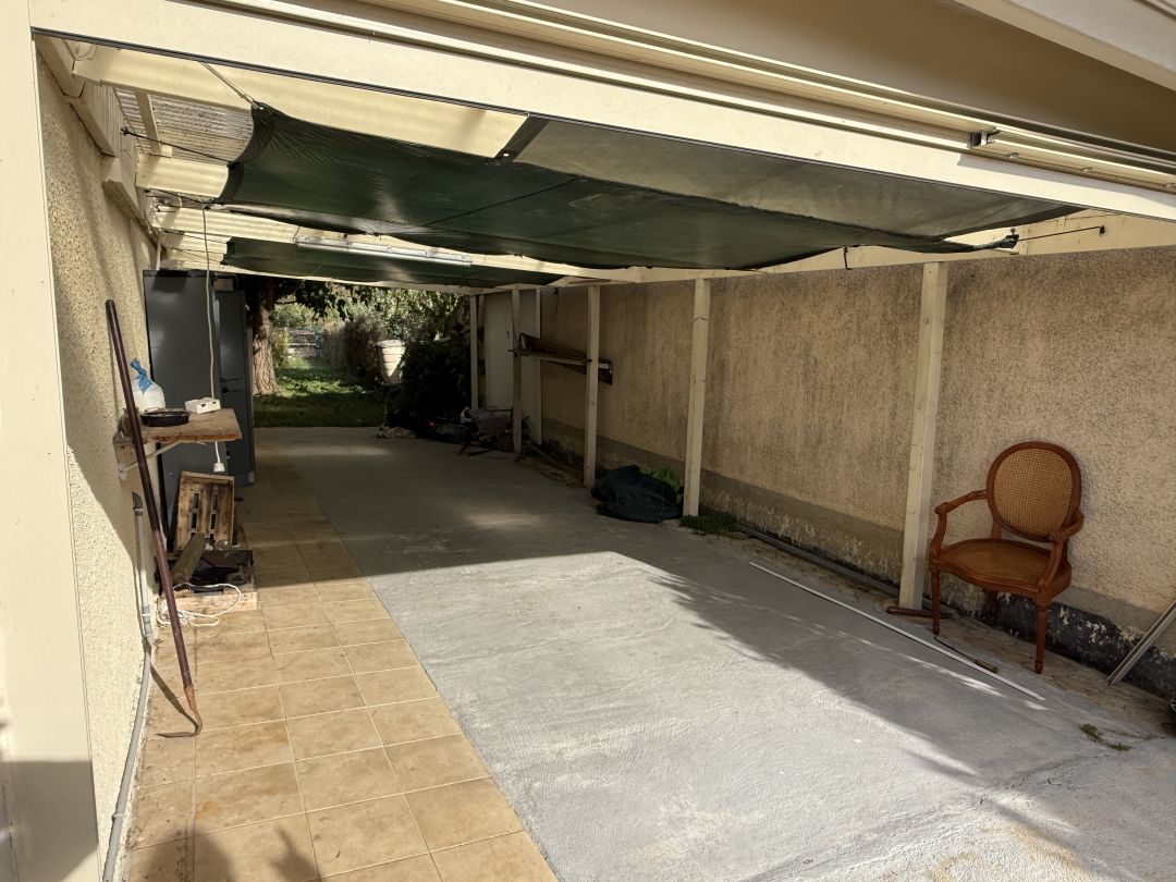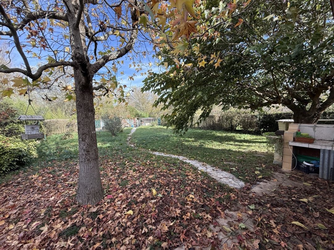 Le jardin clos et arboré accueille un abri voiture attenant à la maison et un devant de porte maçonné permettant le stationnement de plusieurs véhicule.